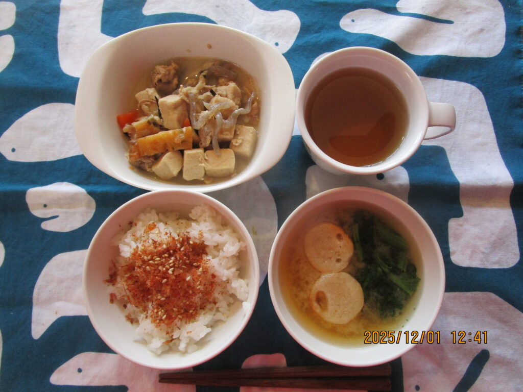 12月1日(月) ごはん かつおふりかけ 高野豆腐と豚肉の煮物 ほうれん草と麩の味噌汁