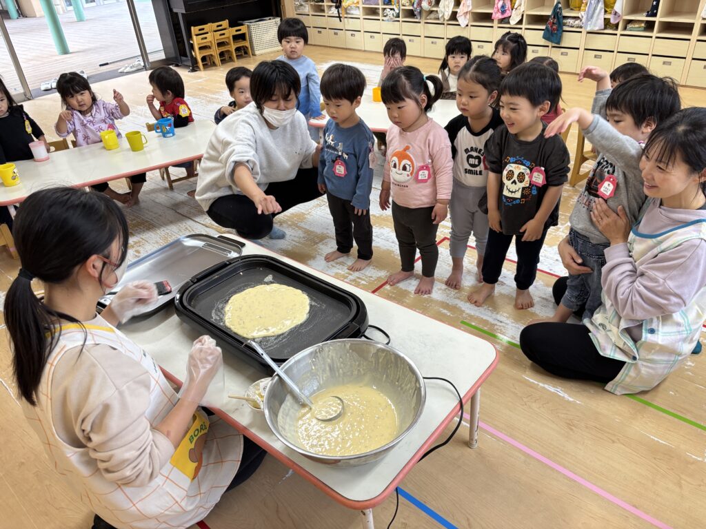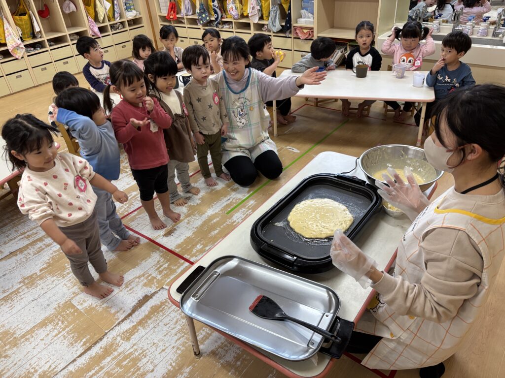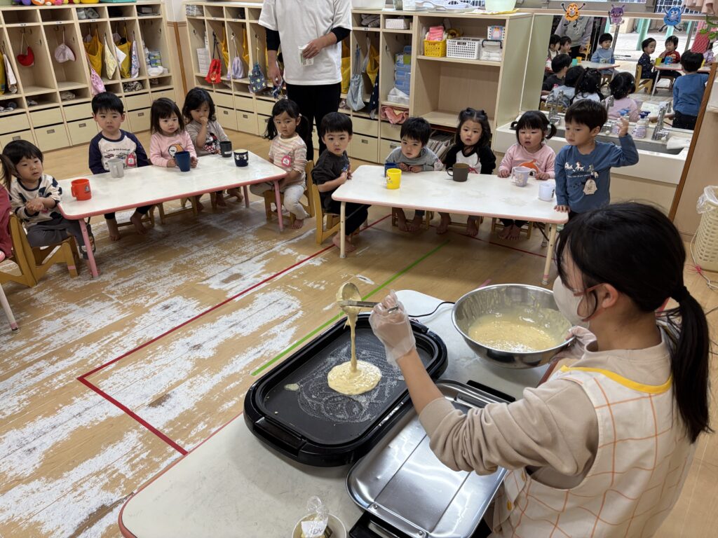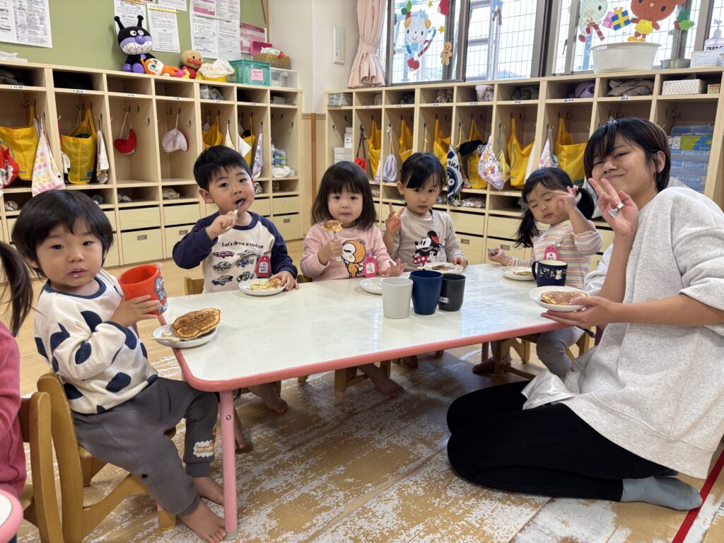ホットケーキが出来上がるとお口いっぱいにほおばりながら、「おいしい」「おかわりあるかなぁ。」とあちらこちらから嬉しい声が聞こえてきて、楽しい雰囲気でおやつの時間をすごしていましたよ。