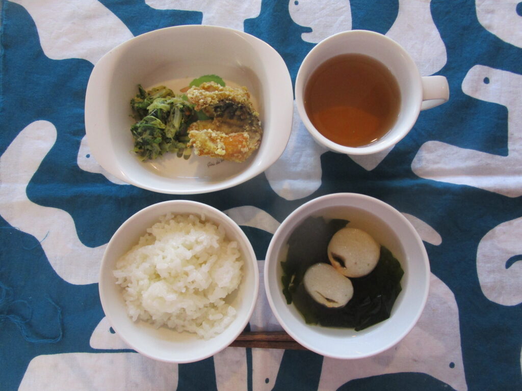 12月11日(木) ごはん 鯖のサクサク揚げ 桜エビのサラダ 若布と麩のすまし汁