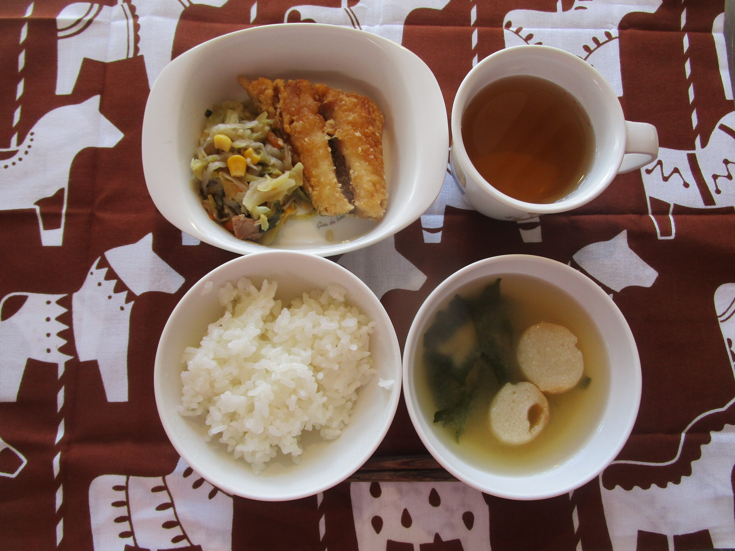 1月8日(木) ごはん 鯖の竜田揚げ 野菜炒め 若布と麩の味噌汁