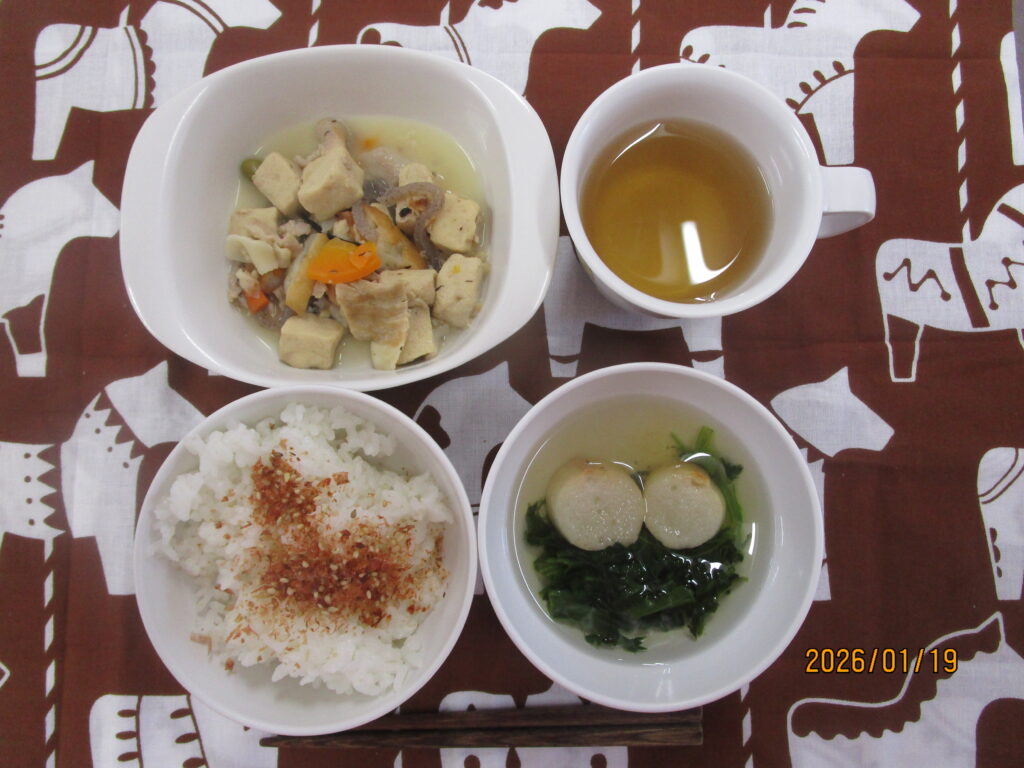 1月19日(月) ごはん かつおふりかけ 高野豆腐と豚肉の煮物 ほうれん草と麩のすまし汁
