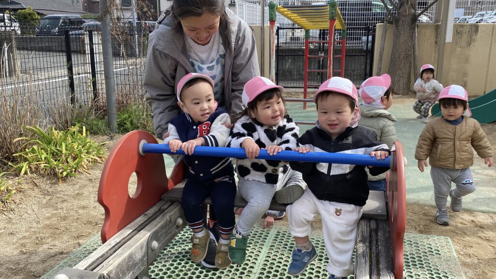 うさぎ組さんになるよ♪と、期待が持てるようにと本館の園庭に遊びに行ったり、うさぎ2組さんのお部屋に遊びに行ったりしているみんなです。