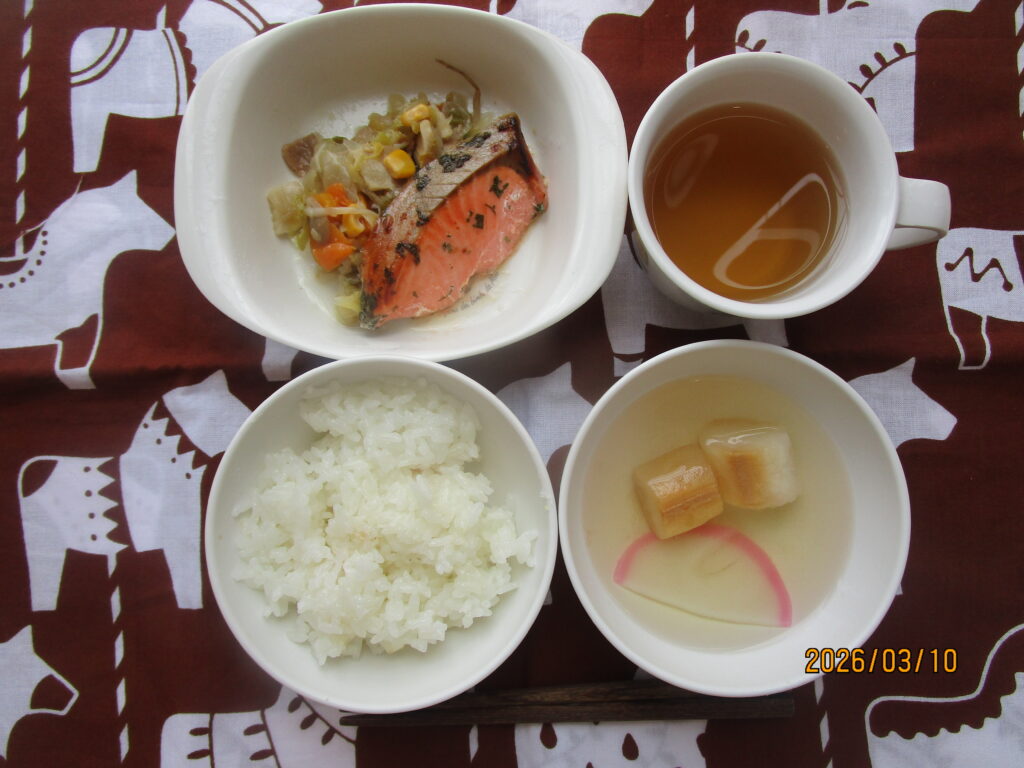 3月10日(火) ごはん 鮭のしそ香り焼き 野菜炒め 麩とかまぼこのすまし汁