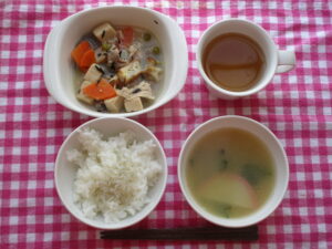 4月6日(月) ごはん ちりめんじゃこ 高野豆腐の煮物 ほうれん草とかまぼこの味噌汁