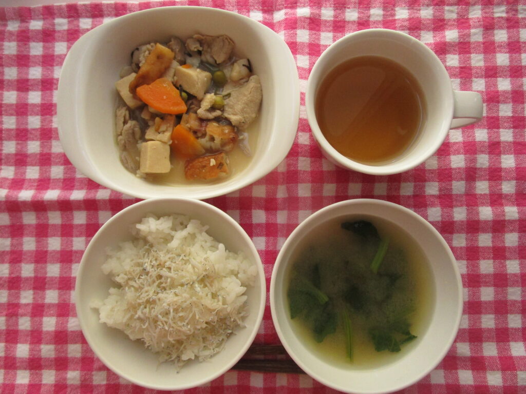 4月20日(月)ごはん ちりめんじゃこ 高野豆腐の煮物 ほうれん草とかまぼこの味噌汁