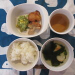 10月31日(金)ごはん 鶏肉の梅味噌焼き ブロッコリーのサラダ 若布と麩のすまし汁